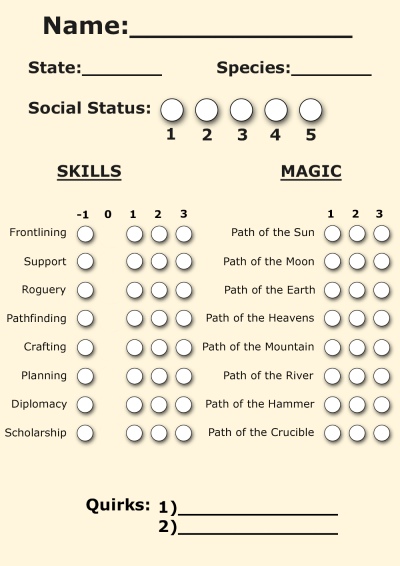 Once you have a concept, you will need to go through the following steps to mechanically represent your character. There is a summary and visual representation of a character sheet below.
